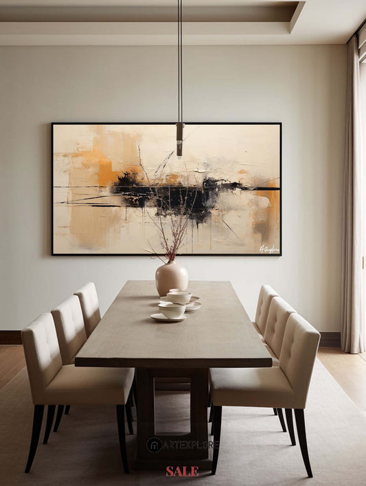 Contemporary Abstract Oil Painting in Warm Tones and Bold Black Accents