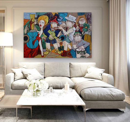Colorful Pop Art Oil Painting of Musicians and Monkeys in Vibrant Abstract Style