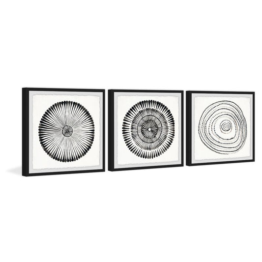 Elegant Black and White Circle Bloom Abstract Triptych Wall Art
