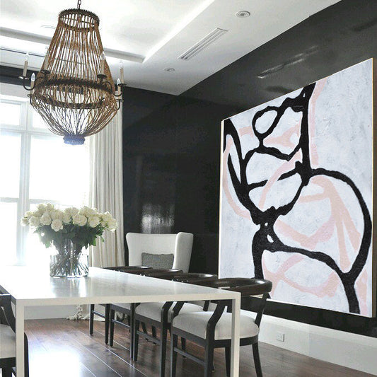 Contemporary Abstract Oil Painting in Black and Soft Pink Tones for Modern Decor