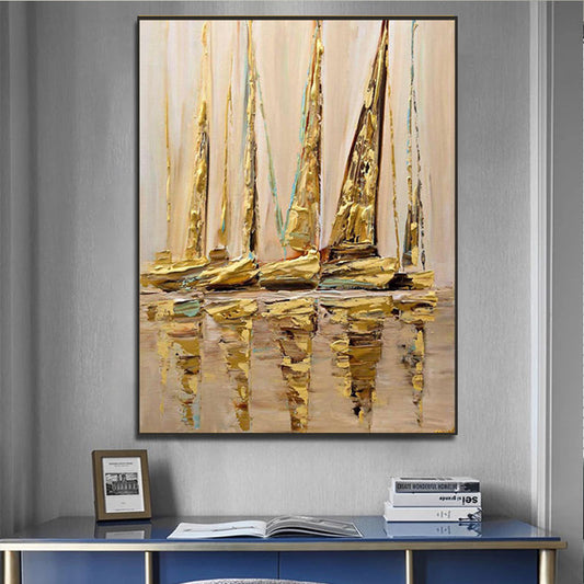 Golden Reflections: Elegant Sailboats in a Serene Seascape Oil Painting