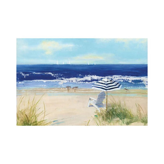 Tranquil Beach Scene with Umbrella and Chair - Coastal Oil Painting