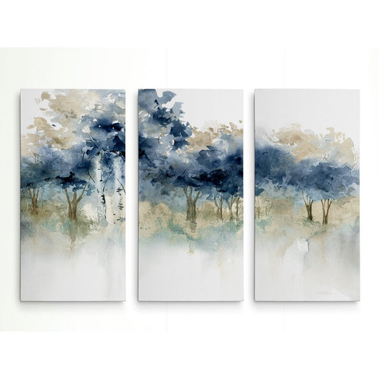 Serene Triptych Oil Painting of Tranquil Waters and Lush Blue Trees