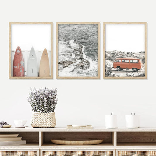 Coastal Surfboard Art Triptych - Vintage Beach Van and Waves - Nature Decor