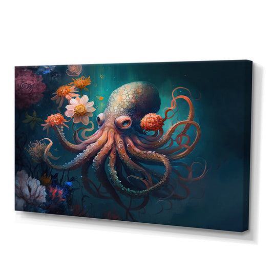 Colorful Octopus Underwater with Floral Elements - Vibrant Ocean Art