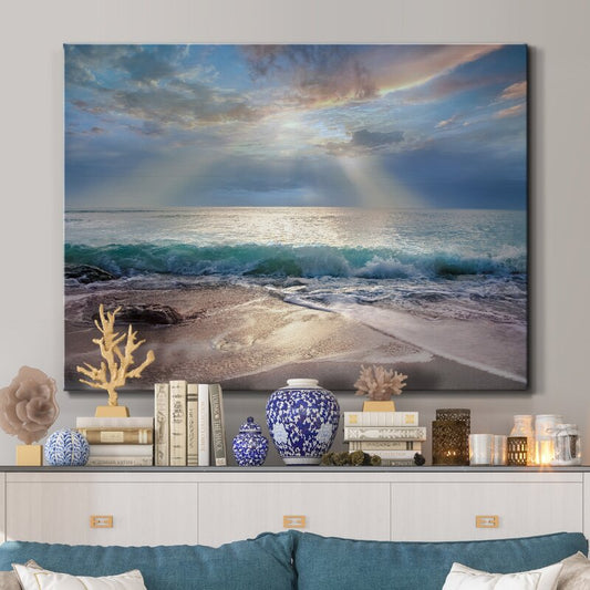 Tranquil Aqua Blue Ocean Sunrise Oil Painting for Serene Home Decor
