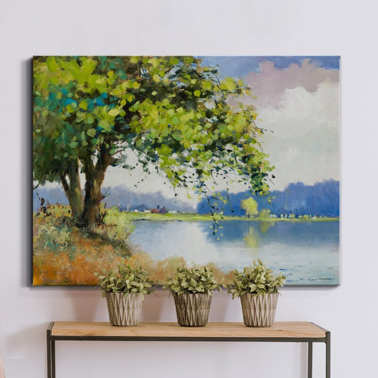 Tranquil Waterside Oil Painting with Canoe and Reeds