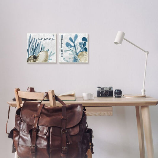 Coastal Art Pair - Relax and Unwind Nautical Shell and Coral Oil Paintings