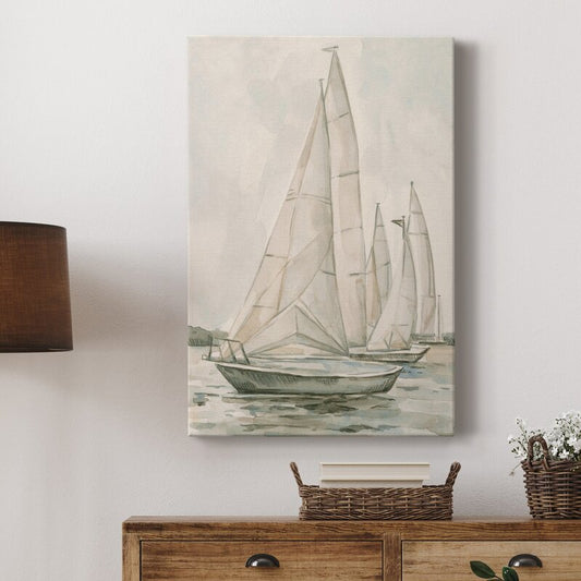 Sailing Serenity: Elegant Oil Painting of Classic Sailboats on Tranquil Waters