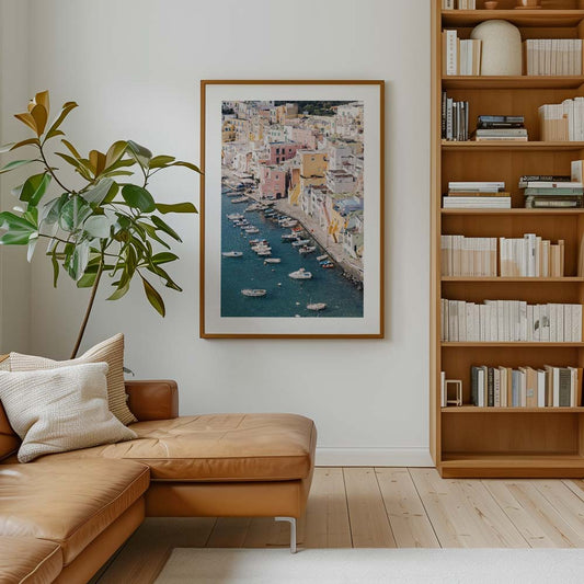Vibrant Coastal Scene of Procida with Colorful Houses and Boats on Blue Water