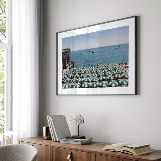 Vibrant Beach Scene with Colorful Umbrellas and Serene Ocean Views