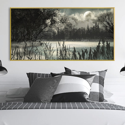 Serene Night Landscape Oil Painting with Moonlit Reflection on Water