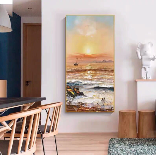 Serene Coastal Sunrise Oil Painting - Vibrant Waves and Tranquil Landscapes