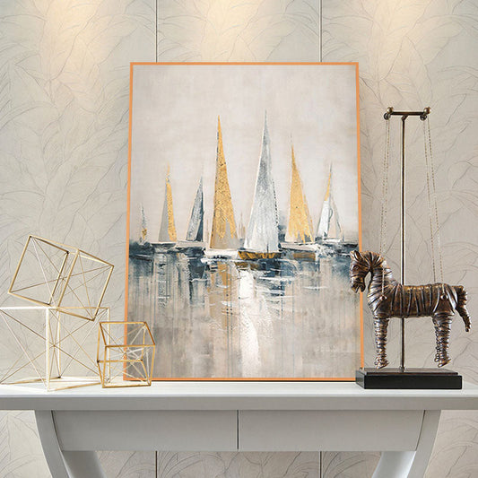 Serene Coastal Sunset Oil Painting with Sailing Boat and Gentle Waves