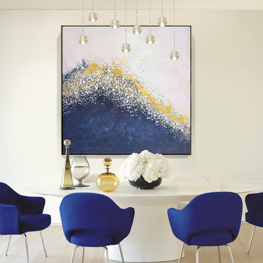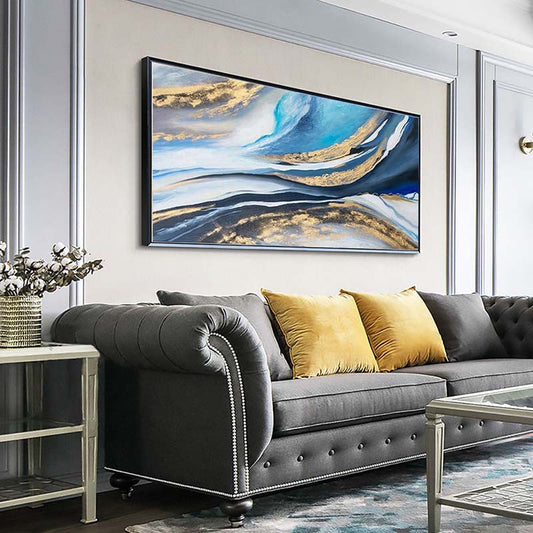 Serene Coastal Abstract Painting with Gold and Blue Waves for Home Decor