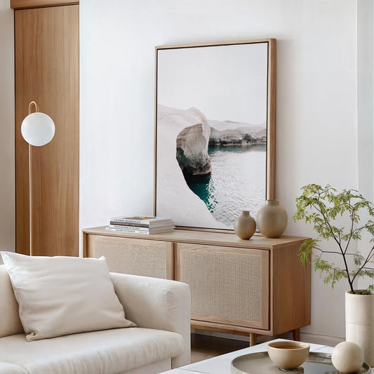 Serene Coastal Landscape Oil Painting of Tranquil Blue Waters and Sandy Shores