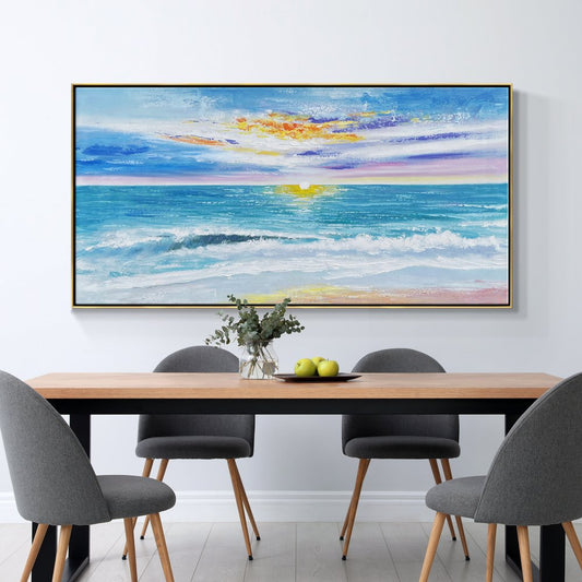 Serene Coastal Sunset: Vibrant Ocean Waves and Colorful Sky Oil Painting