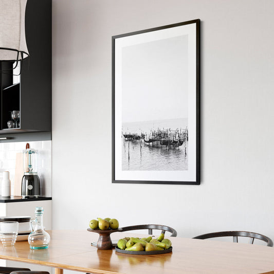 Serene Black and White Oil Painting of Traditional Fishing Boats in Still Waters