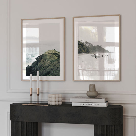 Serene Beach Escape: Surfers at North Wategos Ocean Landscape Oil Painting