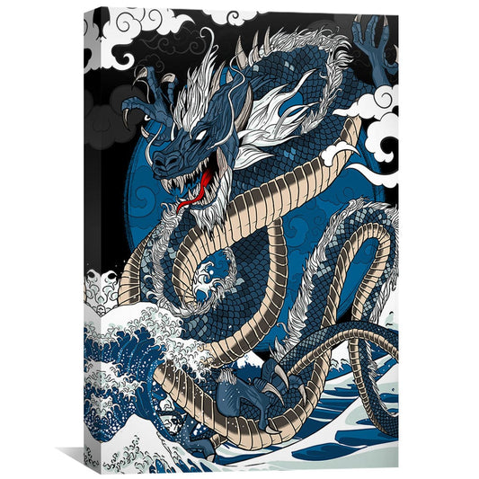 Majestic Blue Dragon Oil Painting with Dynamic Waves and Clouds