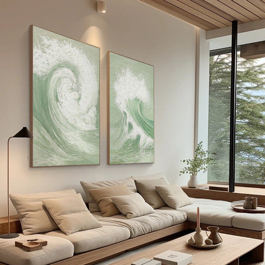 Elegant Green and White Abstract Wave Art for Modern Home Decor Set
