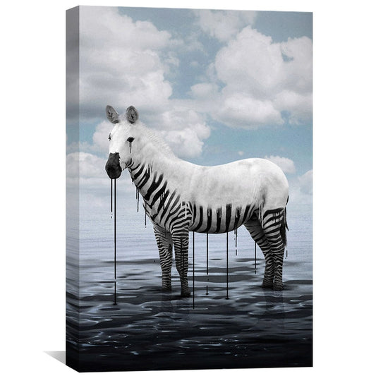 Contemporary Zebra Oil Painting with Dripping Ink and Serene Water Reflection