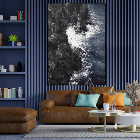 Elegant Ocean Waves: Majestic Black and White Oil Painting for Home Decor