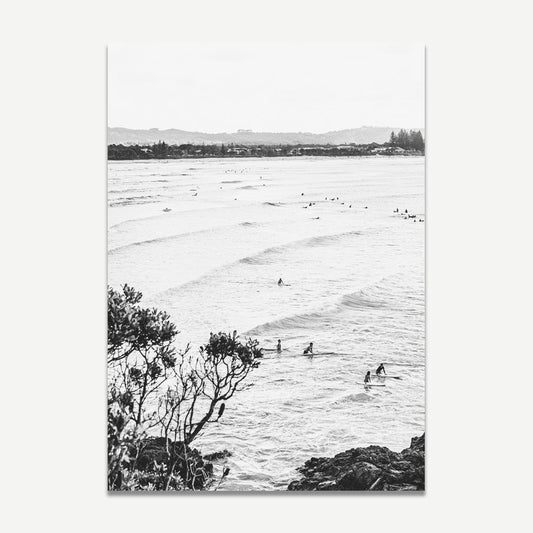 Black and White Coastal Art - Wategos Beach & The Pass Surfers Duo