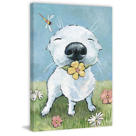 Joyful Dog in Garden with Flower - Whimsical Oil Painting Art for Dog Lovers