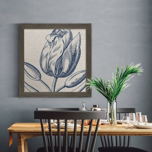 Indigo Floral Oil Painting on Linen - Elegant Framed Artwork for Home Decor