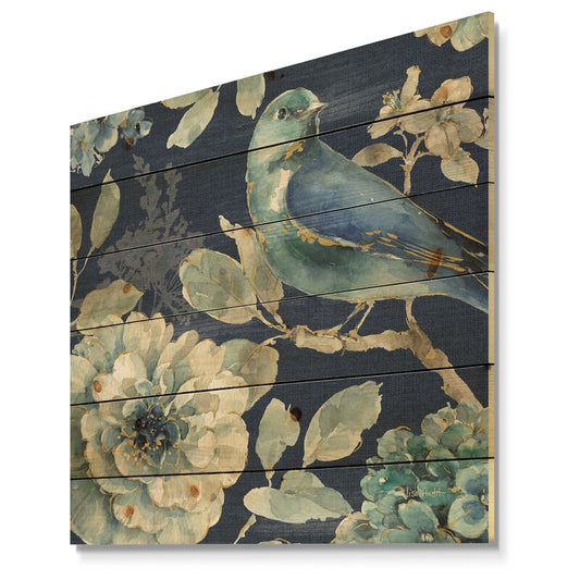 Blue Bird and Floral Farmhouse Painting on Natural Pine Wood