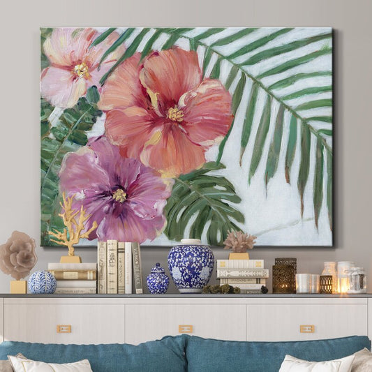 Vibrant Hibiscus Floral Painting with Tropical Greenery
