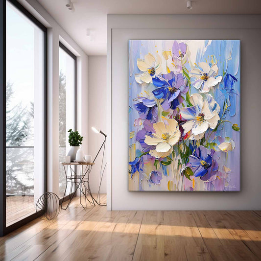 Vibrant Floral Oil Painting - Beautiful Blue and White Flower Art for Home Decor