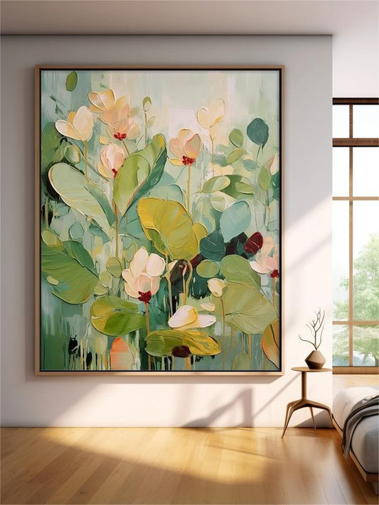 Vibrant Floral Oil Painting with Lush Greenery and Textured Blossoms