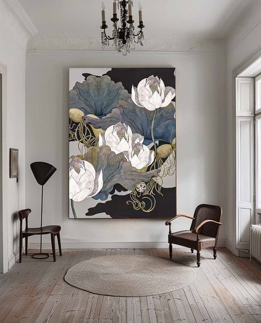 Elegant Flower Oil Painting - Serene Lotus Floral Wall Art for Home Decor