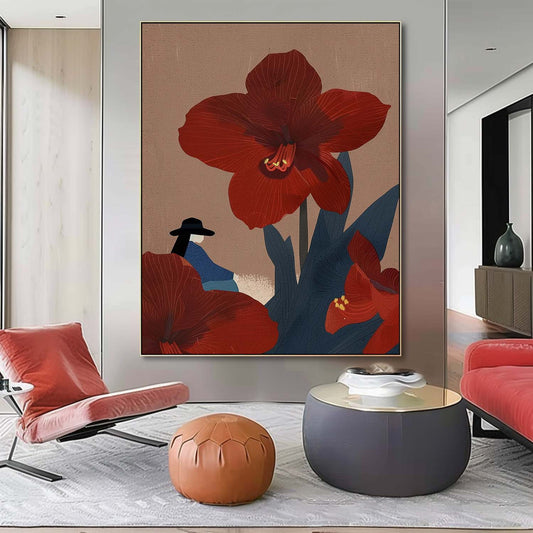 Elegant Red Flower Woman Oil Painting for Modern Home Decor