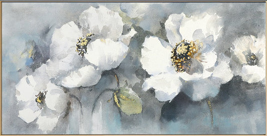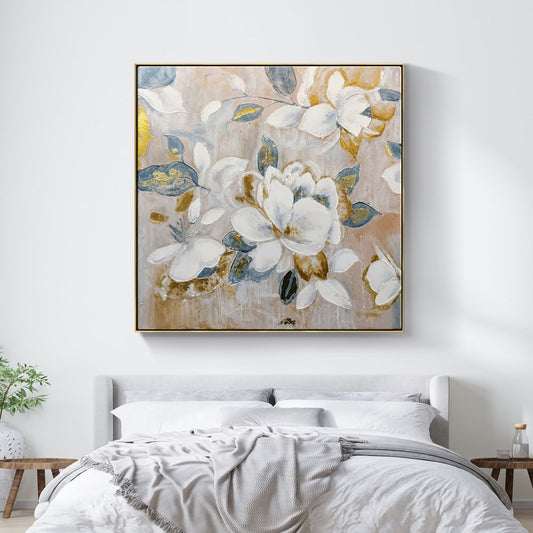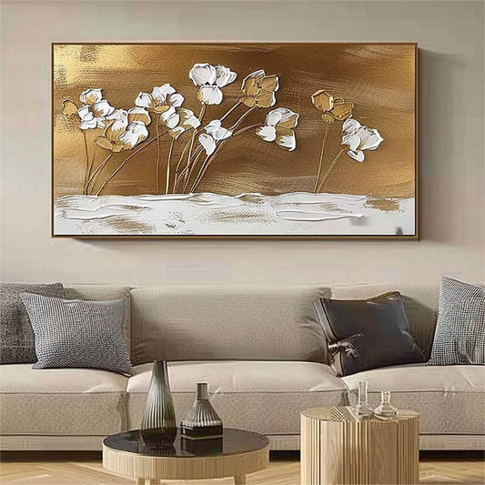 Elegant Floral Oil Painting: White Blooms with Golden Accents for Home Decor