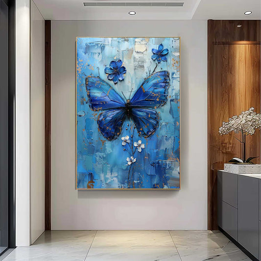 Beautiful Blue Butterfly Oil Painting with Floral Accents for Elegant Home Decor