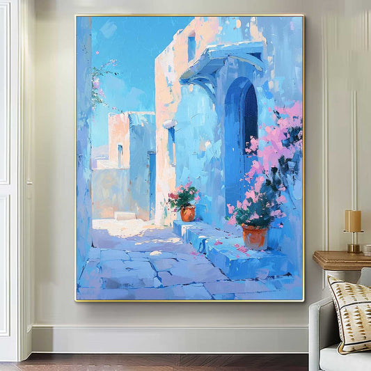 Charming Blue Alleyway Oil Painting with Flower Pots and Architecture