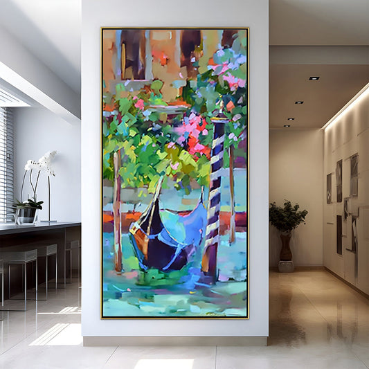 Charming Venetian Gondola with Vibrant Flowers - Colorful Oil Painting