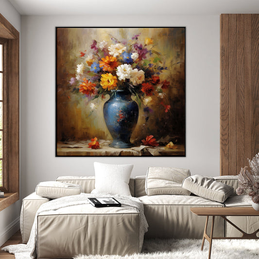 Colorful Autumn Floral Bouquet Oil Painting in Blue Vase for Home Decor