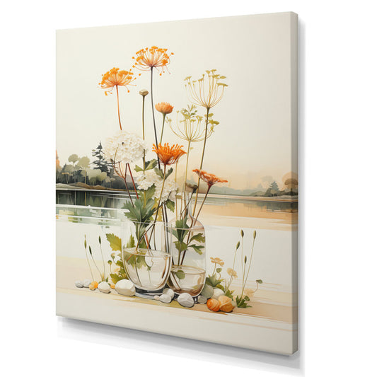 Minimalist White Beige Oil Painting of Elegant Flower Arrangement in Glass Vases