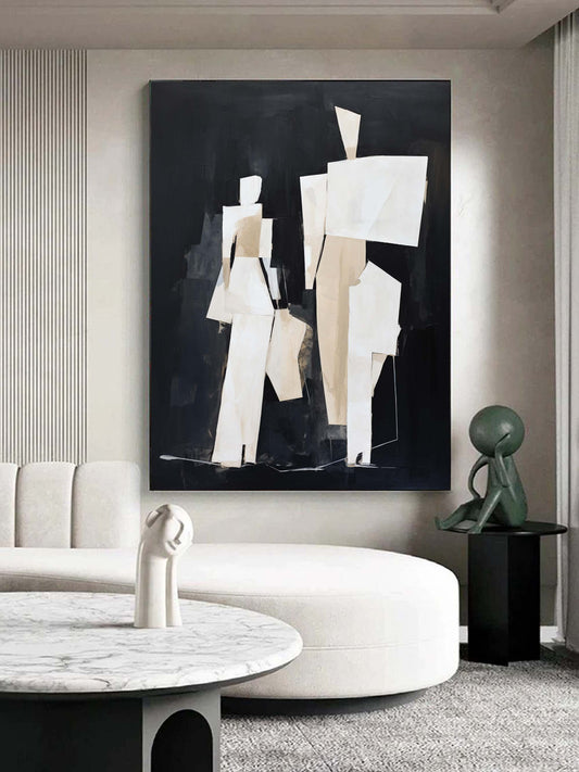 Abstract Minimalist Oil Painting of Figures in Elegant Black and White