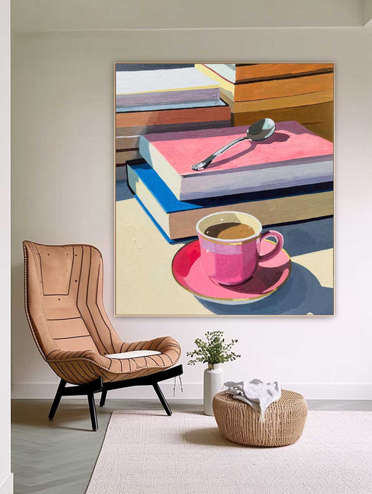 Vibrant Still Life with Coffee and Books - Modern Abstract Oil Painting