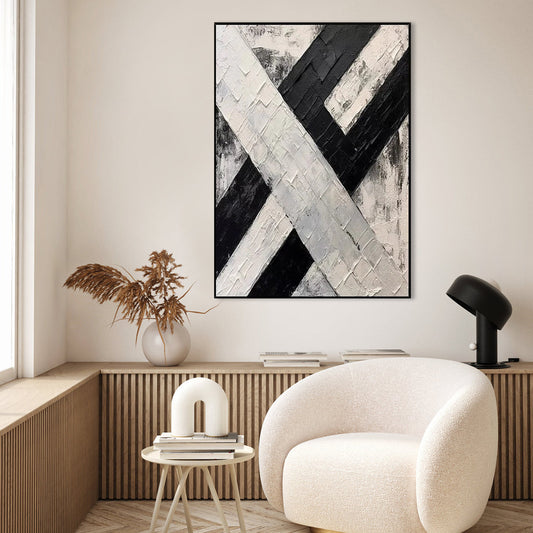 Abstract Black and White Oil Painting of Intersecting Paths for Modern Decor