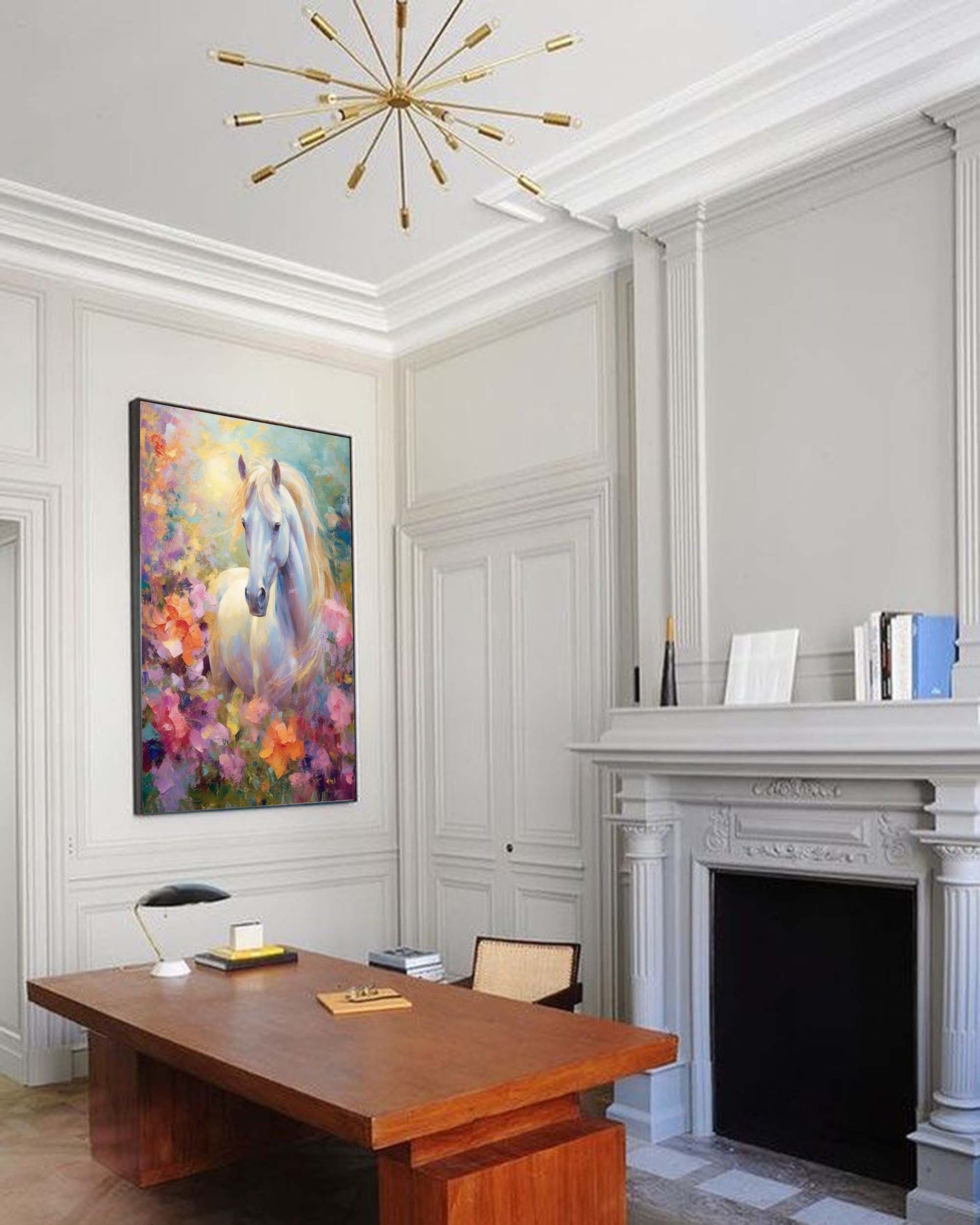 Discover the breathtaking Majestic White Horse Oil Painting, a stunning artwork that beautifully blends the elegance of a white horse with a vibrant floral background. Perfect for art lovers and equestrian enthusiasts, this captivating piece brings a touch of nature's beauty and tranquility into any space. Elevate your home decor or find the perfect gift with this unique and expressive oil painting that celebrates the majesty of horses in a colorful setting. Shop now to bring this enchanting masterpiece into your life!