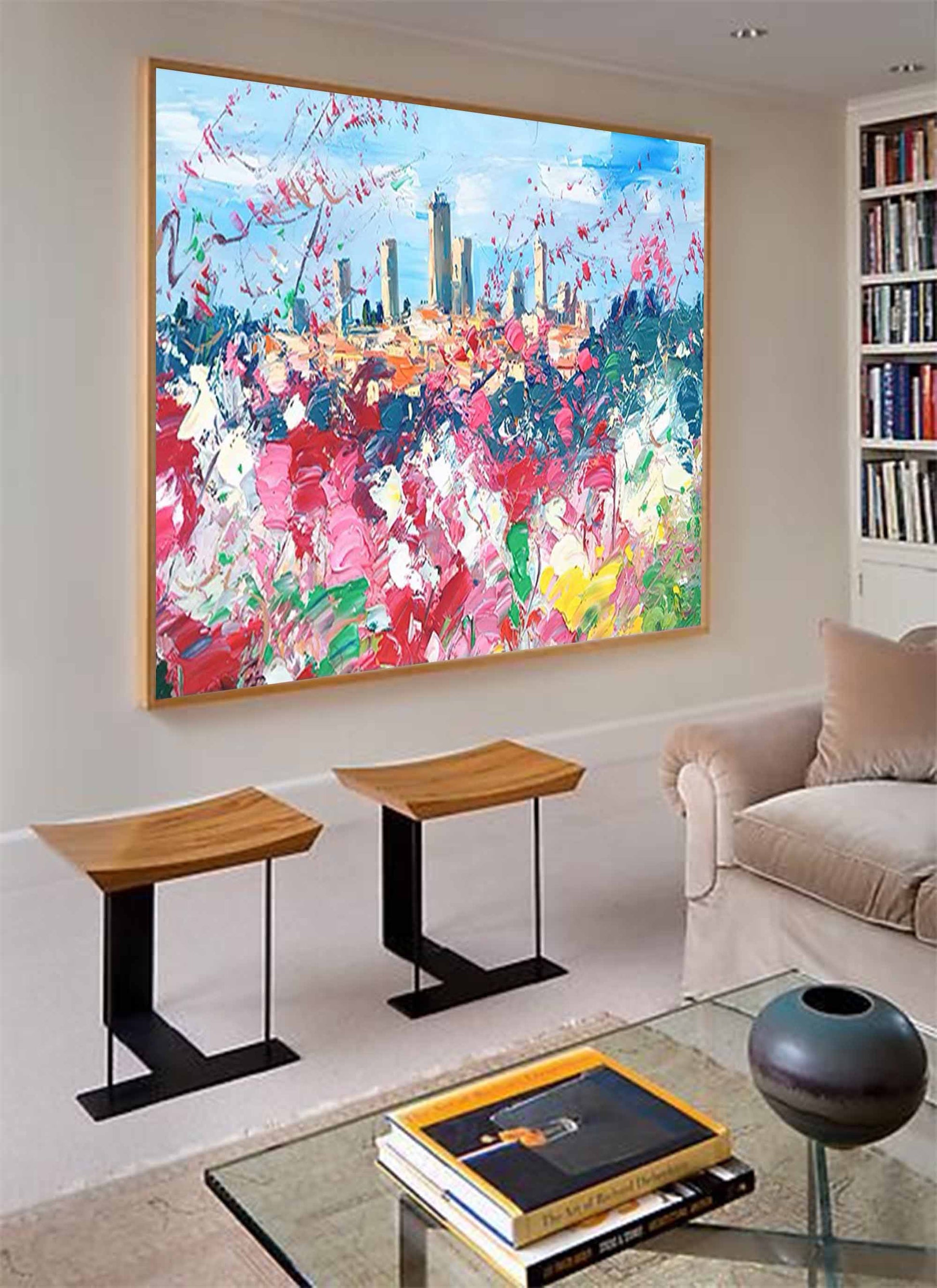 Explore the enchanting beauty of our vibrant cityscape oil painting, featuring a stunning blend of colorful flowers in the foreground. This captivating artwork captures the dynamic spirit of urban life, while the lush florals add a touch of nature's elegance. Perfect for art lovers and home decorators alike, this piece brings warmth and color to any space. Discover how this unique art piece can transform your environment today!
