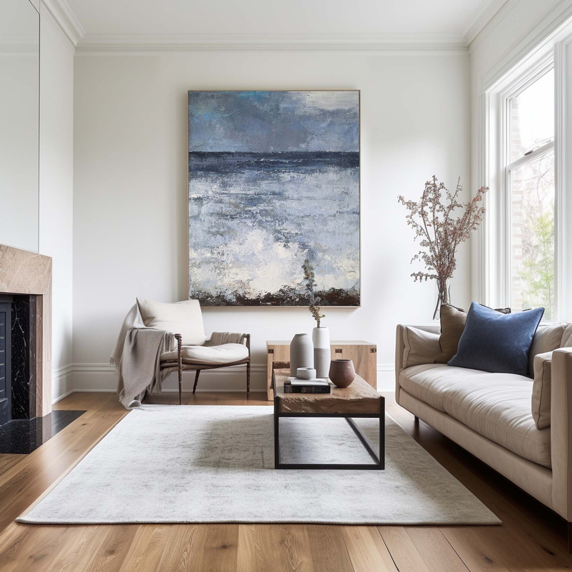 Tranquil Blue Ocean Waves Abstract Oil Painting for Coastal Decor
