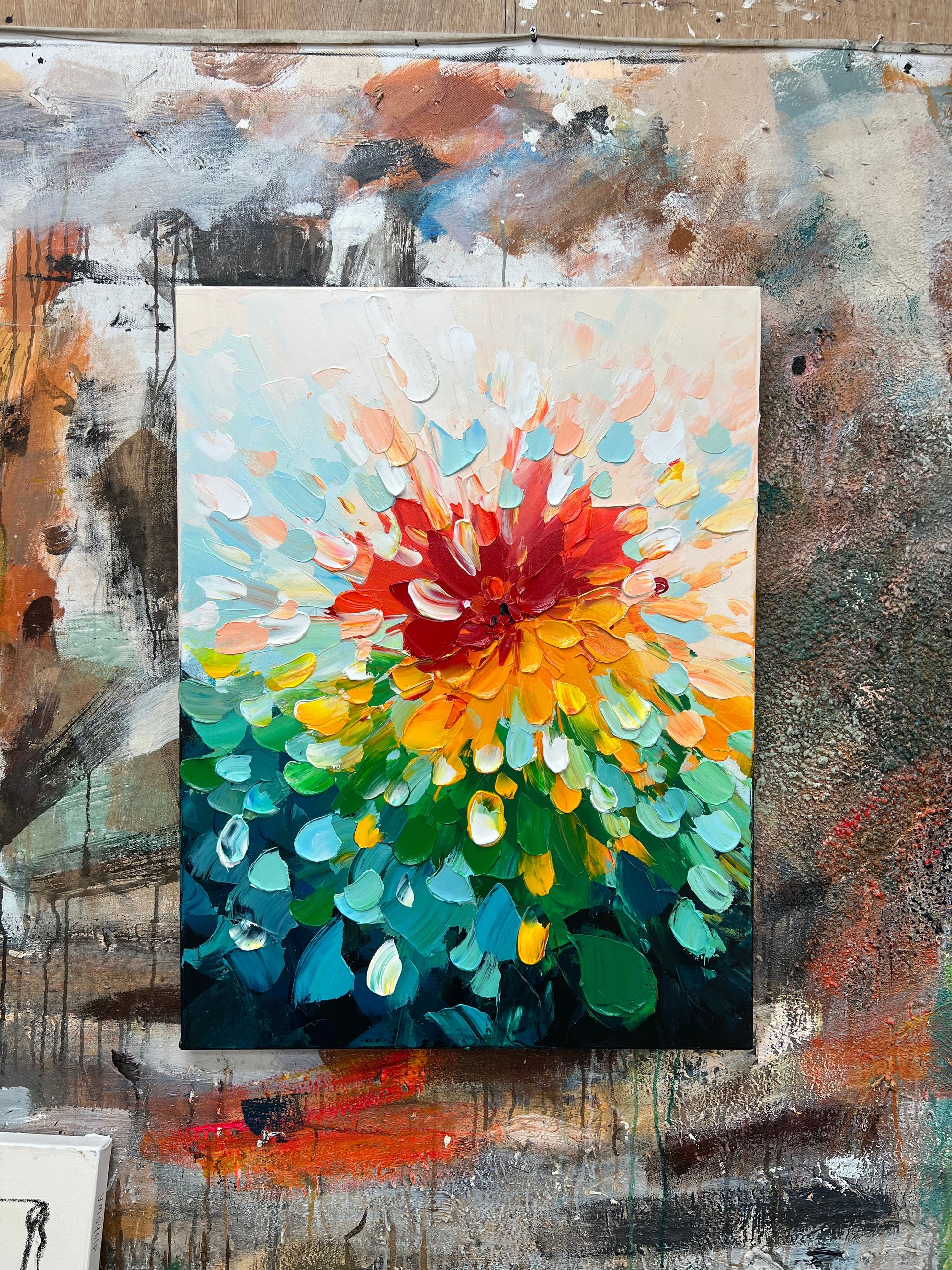 Vibrant Floral Oil Painting with Bold Colors and Textured Brushwork