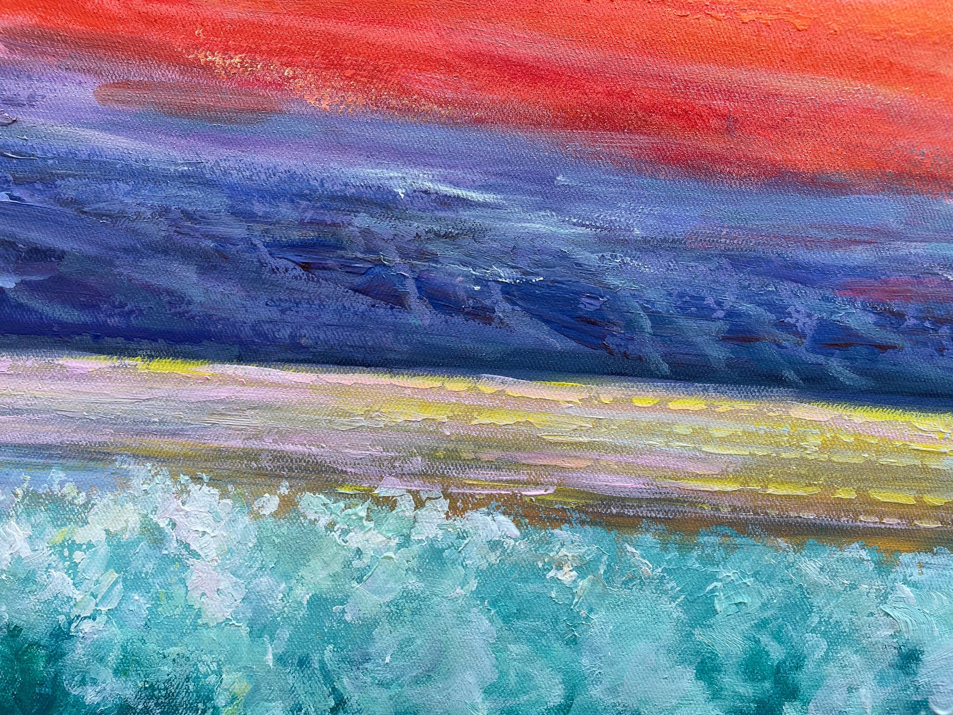 Vibrant Coastal Sunset: Oil Painting of Serene Beach and Colorful Sky